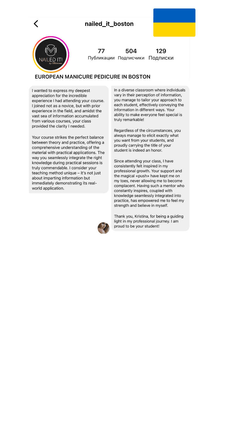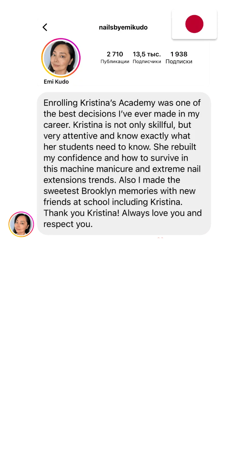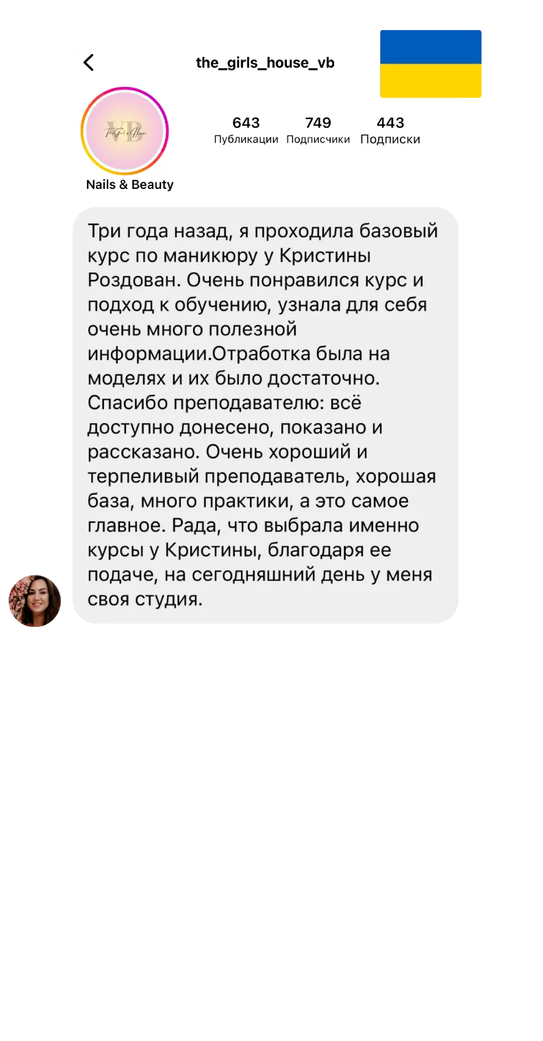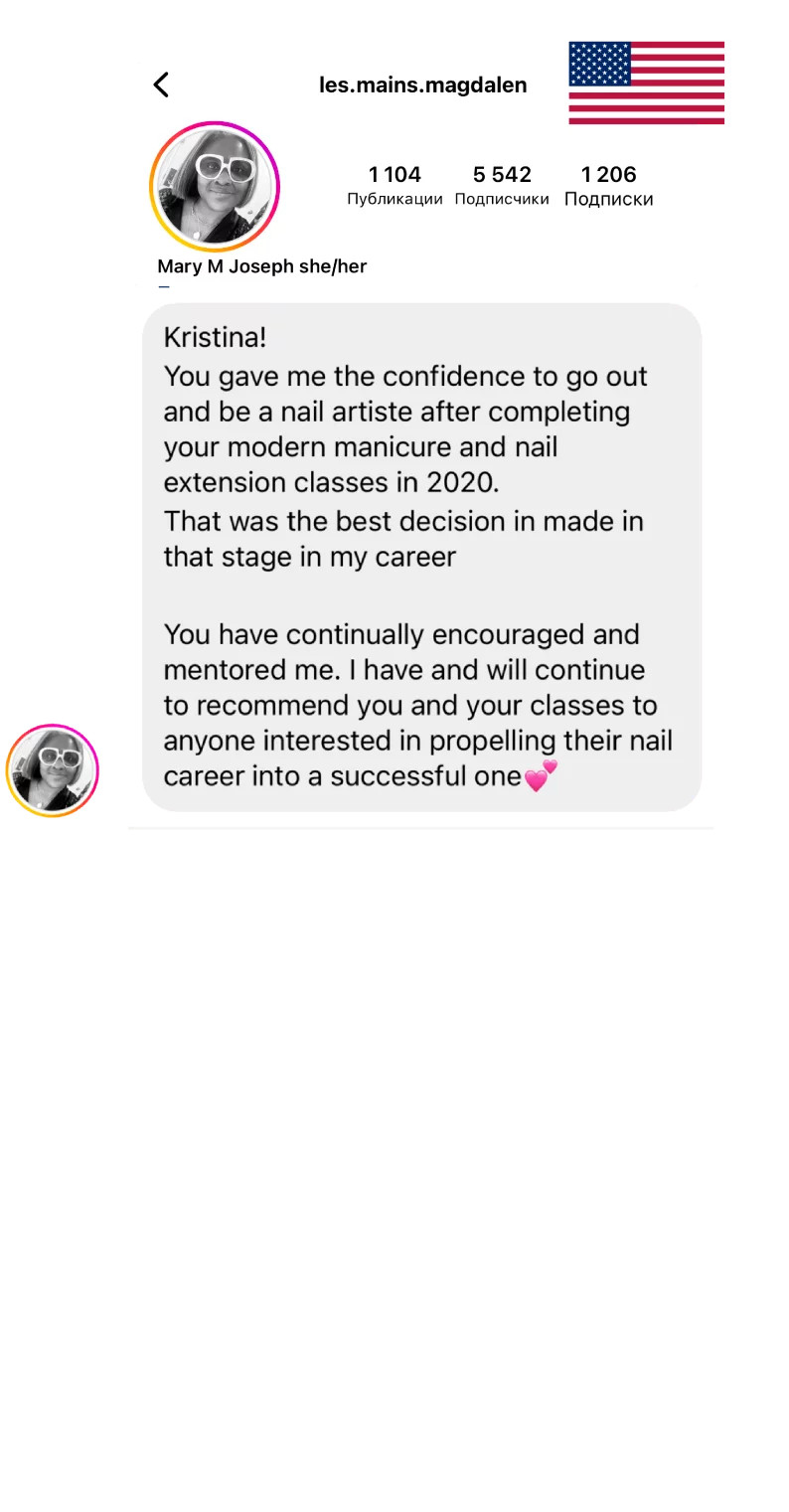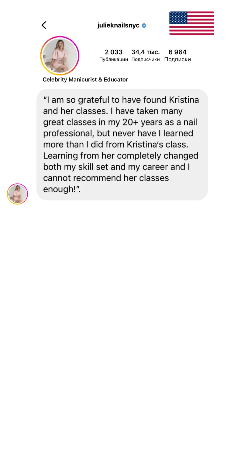 Навыки и знания, которые я приобрела, привели меня к созданию онлайн-платформы для обучения – onlinenaileducation.com. Теперь мои курсы доступны не только оффлайн в Нью-Йорке, но и онлайн, и любой желающий, независимо от местоположения, может пройти мои уроки и перенять мой опыт. Каждый урок наполнен нюансами, которые помогли мне стать лучшей версией себя, и это не просто обучение маникюру – это передача моего опыта, но без тех ошибок, которые я уже преодолела.